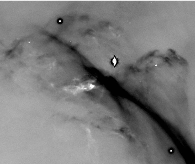 Hα–[S ii] difference image showing the central region of HH 222. Hα-strong regions are black, and [S ii]-strong regions are white. The figure is 2 arcmin wide, corresponding to 0.28 pc at the assumed distance of 460 pc.