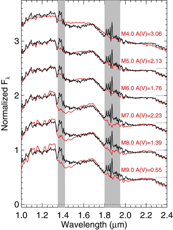Comparison between the spectrum of V380 Ori B (black) and those of six M4-M9 dwarf field standard stars (red; Kirkpatrick et al. 1991; data from Burgasser et al. 2004, 2008) with different extinctions, showing good correspondence for M5–M6 stars with low extinction. The regions most affected by telluric absorption are shaded in gray, and were not used in the fits.