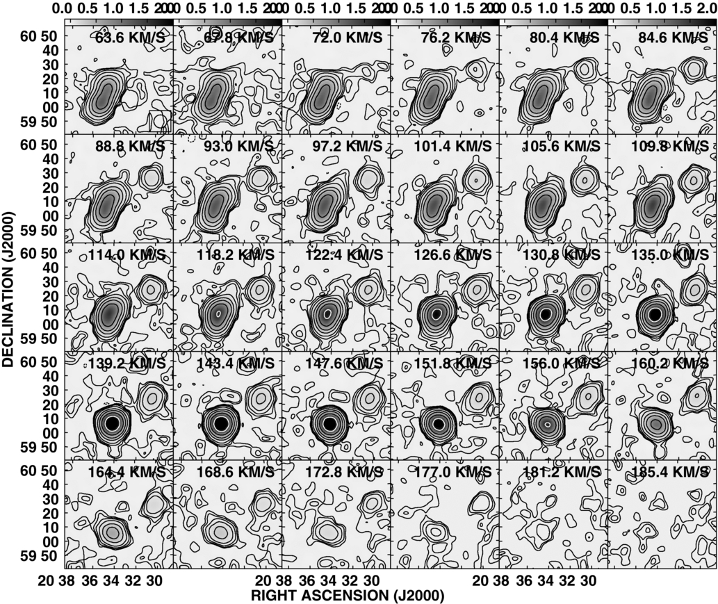 GBT H i channel maps of NGC 6946, its companions, and the H i filament. Contours are at −2σ, 2σ, 3σ, 5σ, 10σ, 25σ, 50σ, 100σ, and 200σ, where σ = 8 mJy beam −1 over a 4.2 km s −1 channel. The grayscale has units of mJy/GBT beam.
