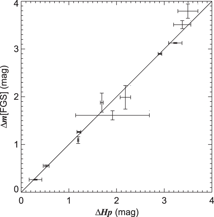 Comparison of magnitude differences from Hipparcos and FGS for pairs in common. The estimates agree within uncertainties with the expected one-to-one relationship (shown as a solid line of slope unity).