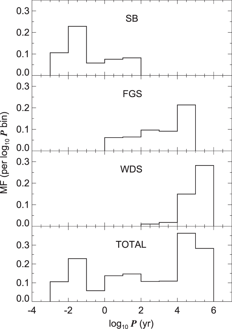 Histograms of the multiplicity fraction (MF) plotted as a function of orbital period. From top to bottom, successive panels show the distributions for the spectroscopic binary (SB), Fine Guidance Sensor (FGS), Washington Double Star (WDS), and total samples, respectively.