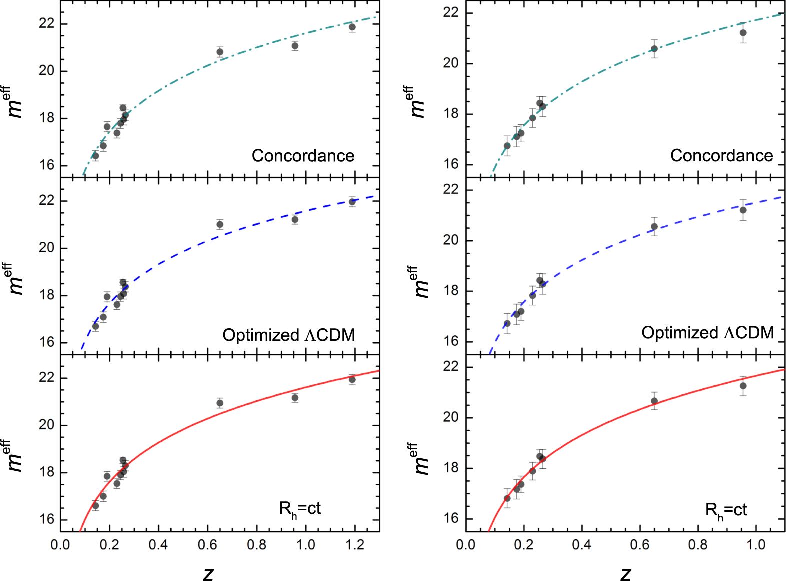 Hubble diagrams for SLSNe Ic. The effective apparent magnitudes of SLSNe Ic are plotted as solid points, together with their corresponding best-fit theoretical curves. Left: the effective magnitudes are calculated using the ﹩{\Delta }{{M}_{30}}﹩ decline relation. Right: the effective magnitudes are calculated using the peak magnitude–color evolution relation.