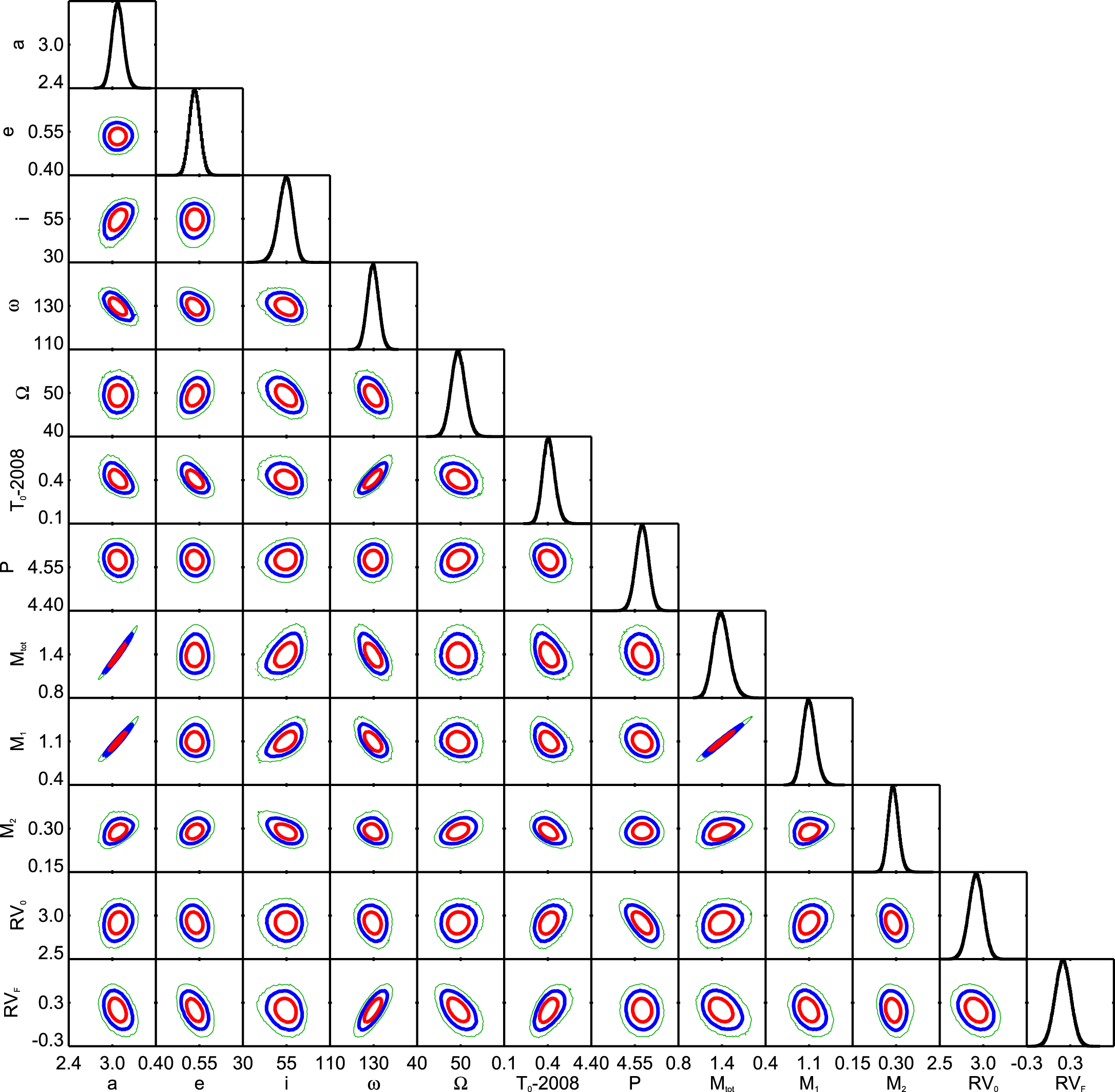 Marginalized posterior distributions on all orbital parameters in diagonal elements, and covariances between them in the off-diagonal elements, with red, blue, and green contours representing 68%, 95%, and 99.7% enclosed probability. Fit orbital parameters are semimajor axis (a, au), eccentricity (e), inclination angle (i, degrees), argument of periastron (ω, degrees), position angle of nodes (Ω, degrees), epoch of periastron passage (T0, decimal years), total mass (Mtot, solar masses), secondary mass (M2, solar masses), system RV (RV0, km s−1), and FEROS RV offset (RVF, km s−1). Also included are the derived quantities of period (P, years) and primary mass (M1, solar masses). Covariances indicate that future astrometric observations that better constrain the semimajor axis will improve the errors on the mass of V343 Nor Aa.