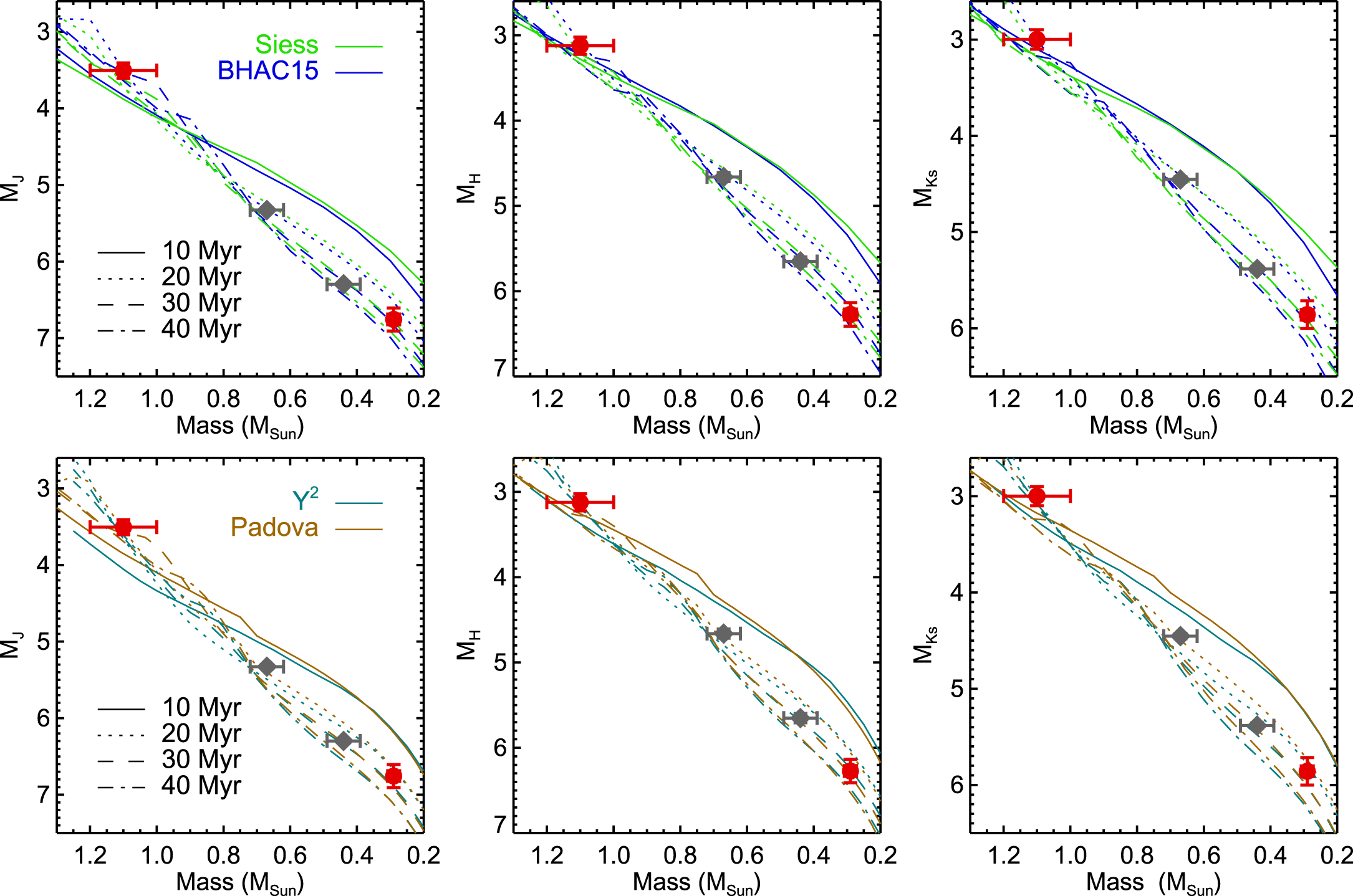 Comparison of the measured photometry and masses of V343 Nor Aa/Ab (red circles) to the four sets of theoretical models, as well as GJ 3305 A/B (gray diamonds) from Montet et al. (2015), showing good agreement for the expected 20–30 Myr age of the system. For the plotted isochrones, colors corresponds to different models, and linestyles to ages.