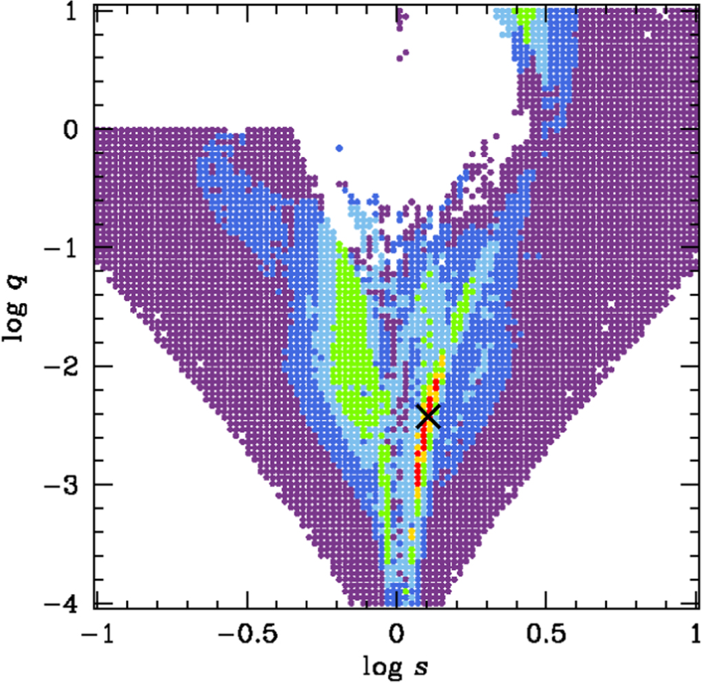 ﹩{\rm{\Delta }}{\chi }^{2}﹩ surface of ﹩(s,q)﹩ parameter space derived from the initial grid search. Each color represents the contour level of ﹩{\rm{\Delta }}{\chi }^{2}\lt 20\sigma ﹩ (red), ﹩\lt 40\sigma ﹩ (yellow), ﹩\lt 60\sigma ﹩ (green), ﹩\lt 80\sigma ﹩ (light blue), ﹩\lt 100\sigma ﹩ (blue), and ﹩\lt 120\sigma ﹩ (purple), respectively. The location of the best-fit solution is marked by the cross symbol.