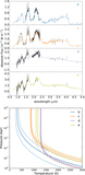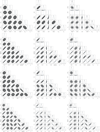 Performing retrieval on a mock data set, where the “ground truth” is known (see the text for input parameters). We focus on performing retrieval with the UB model (see Table 1). The columns represent the different wavelength coverages: 0.7–5 μm with 0.01 μm resolution (first column), HR 8799b-like data (second column) and HR 8799e-like data (third column). The rows represent different assumptions for R and g: fixed R and g (first row), fixed R but g is a fitting parameter (second row), fixed g but R is a fitting parameter (third row), both R and g are fitting parameters (fourth row). The labels “CO,” “CO2,” “CH4,” and “H2O” refer to the mixing ratios of carbon monoxide, carbon dioxide, methane, and water, respectively. ﹩{T}_{\mathrm{int}}﹩ is in units of K. The labels “﹩{\kappa }_{0}﹩” and “gravity” are for ﹩\mathrm{log}{\kappa }_{0}﹩ and ﹩\mathrm{log}g﹩ in mks and cgs units, respectively.