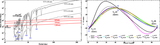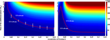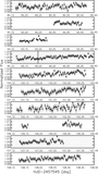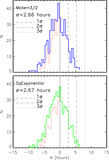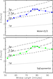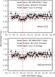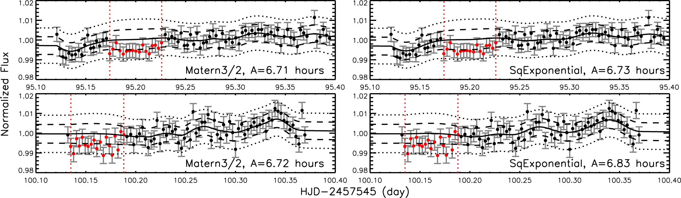 Illustration of the GP framework. Two windows with a time length of 80 minutes are presented. The left panels are the GP regressions using the Matérn 3/2 kernel and the right panels are for the Squared Exponential kernel. In all panels, the blocked data points are in red, the solid line is the best prediction of GP regression, and the dashed lines and dotted lines are the 1σ and 2σ confidence regions, respectively. The integrated depths of these two windows are the largest among those of all the 80 minute windows. The window in the top panels matches the candidate transit event of Proxima Centauri b, having an integrated depth of AM = 6.71 hr for the Matérn 3/2 kernel, while ASE = 6.73 hr for the Squared Exponential kernel. The window in the bottom panels has AM = 6.72 hr and ASE = 6.83 hr.