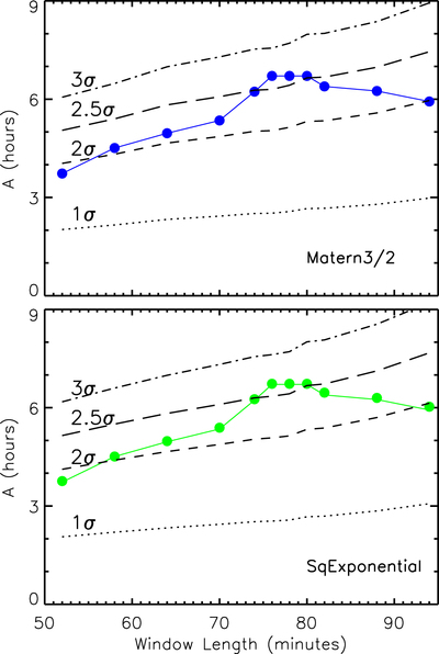 Standard deviations of the integrated depths for different window lengths (dotted and dashed curves) and the integrated depths of different-size windows centered at the midtime of the candidate transit event (color points). The integrated depths peak at the time lengths of 76, 78, and 80 minutes, which are close to the transit duration, in our grid of GP analysis. These three windows contains the same photometric data points, thus they are identical. That window matches the candidate transit event in midtime and length. Its integrated depth is over the 2.5σ threshold in both the Matérn 3/2 GP model and Squared Exponential GP model cases.