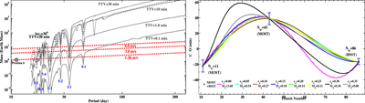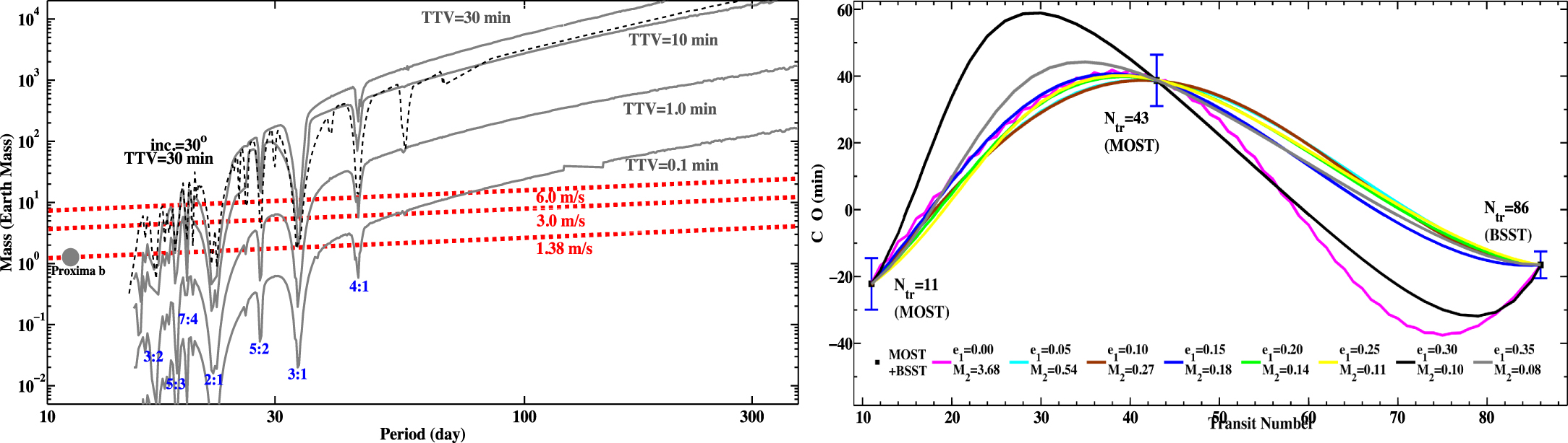 Simulations of TTVs of Proxima Centauri b due to an outer planet. Left panel: TTVs due to an outer planet with various masses and periods. The gray solid lines from top to bottom represent TTV = 30, 10, 1, 0.1 minutes, respectively. In these simulations, we assume a coplanar orbital configuration of the two planets, where the eccentricity of Proxima Centauri b is set to e = 0.1 and the outer planet is in a circular orbit. The black dashed line is a non-coplanar (i.e., inclination = 30°) model, producing TTV = 30 minutes. The red dotted lines represent reflex stellar RV amplitudes induced by the outer planet. Note that any planet with RV amplitude >3 m s−1 can be ruled out by the RV observation of Anglada-Escudé et al. (2016). Right panel: eight arbitrary TTV models fit to the misalignment of the transit epochs observed by MOST and BSST. In these models, the outer planet is in a coplanar near 2:1 mean motion resonance orbit with Proxima Centauri b, and its period is set to 22.58509 days arbitrarily. The curves with different colors represent best-fitted models for different designated eccentricities of Proxima Centauri b, varying from e = 0 to e = 0.35 in a step sizes of 0.05. The best-fitted masses of the outer planet are listed in the legend.