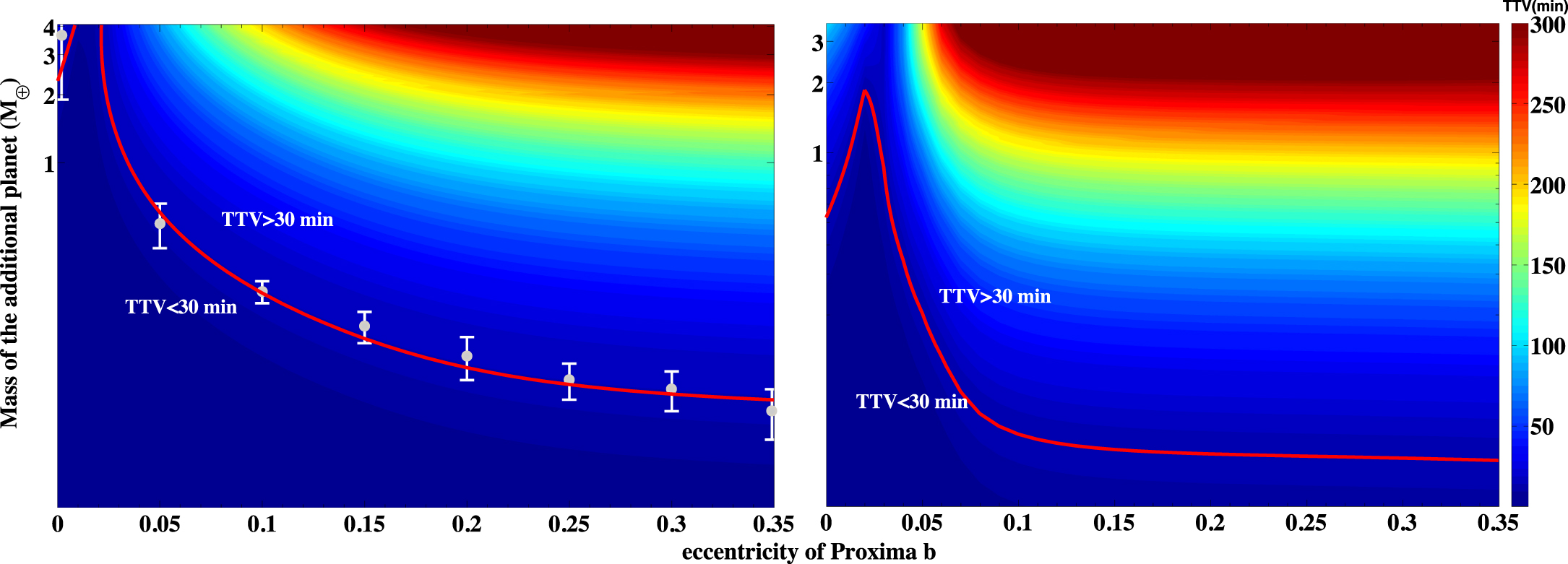 Strengths of simulated TTVs of Proxima Centauri b varying with its eccentricity and the mass of the unseen outer planet, in coplanar near 2:1 and 3:2 MMR orbital configurations. The ranges of the eccentricity and the mass are contained by the RV observation of Anglada-Escudé et al. (2016). The upper limit of the unseen planet is 4.08 M⊕ and 3.60 M⊕ for near 2:1 and 3:2 MMR orbital configurations, respectively. In the left panel, the outer planet has an arbitrary orbital period of 22.58509 days, which is in near 2:1 MMR with Proxima Centauri b. In the simulations, the eccentricity of the outer planet is set to zero. The red solid curve represents the TTVs in strength of 30 minutes. The eight filled circles with error bars represent the arbitrary TTV models in the right panel of Figure 7. The right panel is for the coplanar near 3:2 MMR orbital configuration, where the orbital period of the outer planet is set to 16.89480 days arbitrarily.