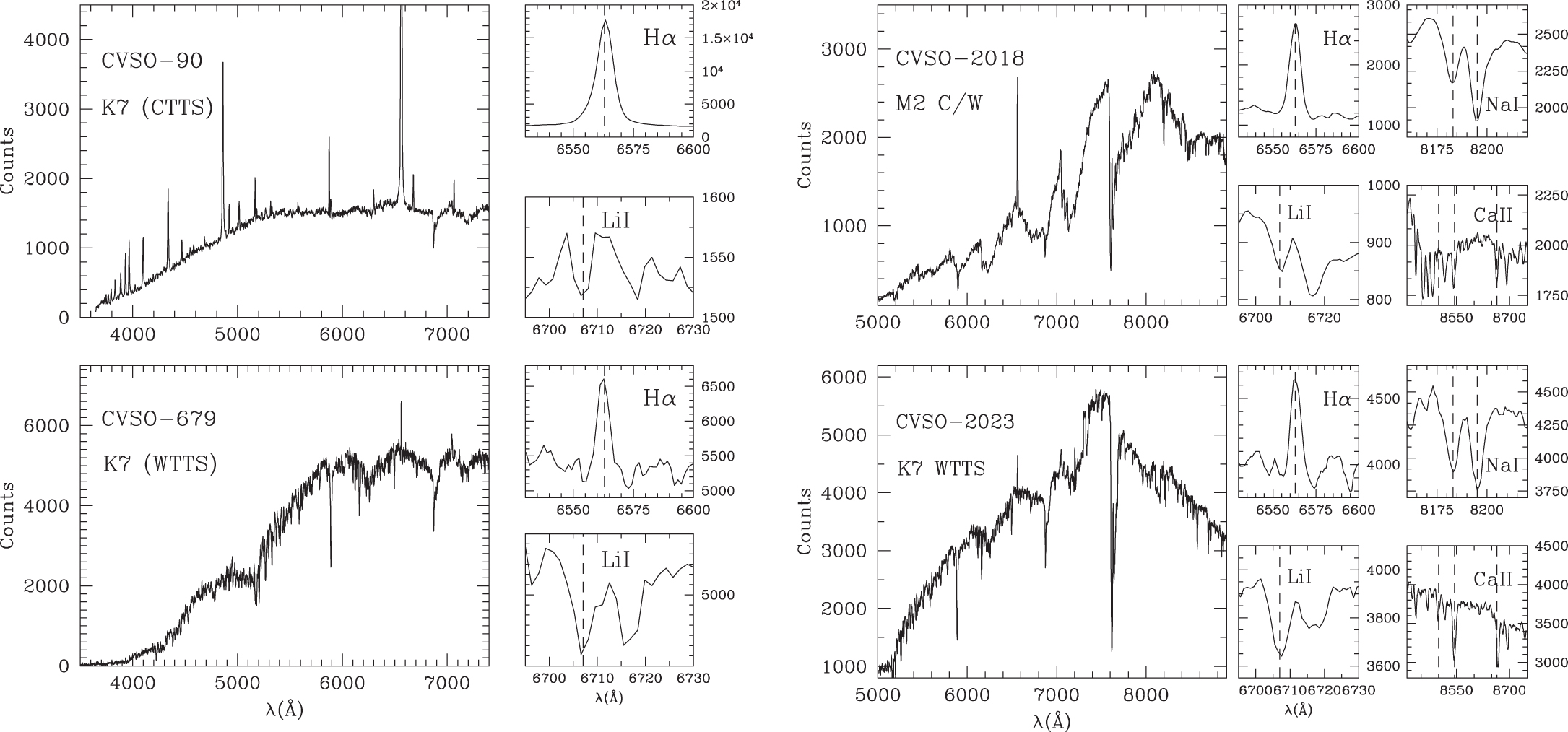 Left: spectra of K7-type TTS obtained with the FAST spectrograph on the SAO 1.5 m telescope. In the upper panels, the CTTS CVSO-90 shows the characteristic extreme emission-line spectrum of a strongly accreting TTS; the equivalent width of the Hα emission line is W(Hα) ﹩=\,-97﹩ Å. The equivalent width of Li I is W(Li I) ﹩=\,0.2﹩ Å, and the absorption line next to it is the Ca I line at 6716 Å. The entire Balmer series is seen clearly in emission; also in emission are the Ca H and K lines (3933 Å, 3968 Å), [O I] at 6300 Å, and He I at 5876 Å and 6876 Å. In contrast, the WTTS CVSO-679 in the lower panels has a weak W(Hα) ﹩=\,-1.6﹩ Å, and no other emission lines; in this star, W(Li I) ﹩=\,0.4﹩ Å. Right: spectra of two newly identified TTSs obtained with the GHTS spectrograph on the SOAR 4.1 m telescope. In the upper panels, the C/W type (see Section 3.3) CVSO-2018 shows the characteristic strong emission-line spectrum of a moderately accreting TTS; the equivalent width of the Hα emission line is W(Hα) ﹩=\,-9.9﹩ Å. The equivalent width of Li I is W(Li I) ﹩=\,0.2﹩ Å, and the absorption line next to it is the Ca I line at 6716 Å. The K7 WTTS CVSO-2023 in the lower panels has a weak W(Hα) ﹩=\,-1.4﹩ Å; in this star, W(Li I) ﹩=\,0.5﹩ Å. In all spectra, the S/N in the region between Hα and Li I is ﹩\gtrsim 20﹩.
