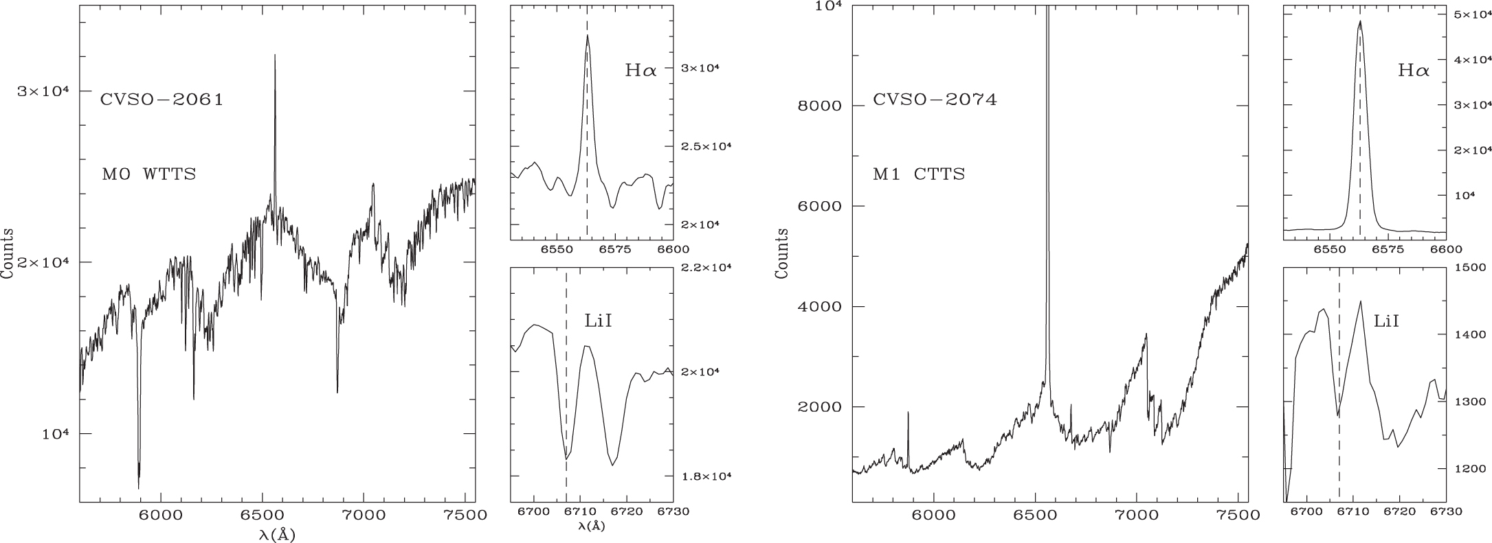 Spectra of two newly confirmed early M-type TTS members of Orion, obtained with the M2FS spectrograph on the 6.5 m Magellan Clay telescope. Left: an M0 WTTS, which has W(Hα) ﹩=\,-2.2﹩ Å and W(Li I) ﹩=\,0.4﹩ Å. In both spectra, the S/N is ﹩\gtrsim 50﹩. Right: an accreting CTTS, with W(Hα) ﹩=\,-139﹩ Å and W(Li I) ﹩=\,0.4﹩ Å. In addition to the strong Hα line, the He I line can also be seen in emission at 5876 Å and 6876 Å, as well as at [O I] 6300 Å.