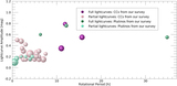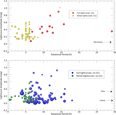 Upper panel summarizes the light-curve studies for the CC population, and the lower one is for the other TNOs. The bubble size indicates the size of the objects (i.e., large bubbles for large objects). The largest visible bubble is for Makemake (H = −0.3 mag, periodicity of 7.65 hr). The same bubble scaling has been used for both plots, allowing a direct comparison between theses two populations. Because of their very long rotational periods (out of the plot’s scale), Sila–Nunam and Pluto-Charon are not plotted.