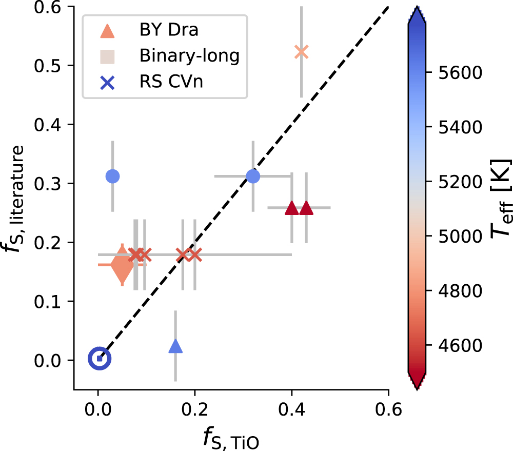 Comparison of literature spot coverage fractions to our results. The Sun is shown with the “⊙” symbol; HAT-P-11 is shown with the large diamond. The most significant outlier is HD 134319 (IU Dra), for which we measure very small spot coverage (see Section 3.2.8). The scatter about the one-to-one correspondence line represents a combination of (1) intrinsic variability in the spotted surface area of each star and (2) underestimated uncertainties in one or both measurements.