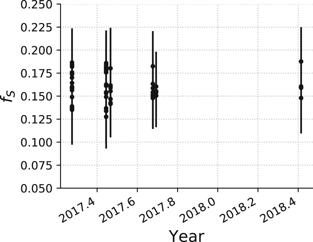 Spot covering fraction fS of HAT-P-11 inferred via TiO absorption from starspots in the spectrum of HAT-P-11 as a function of time.