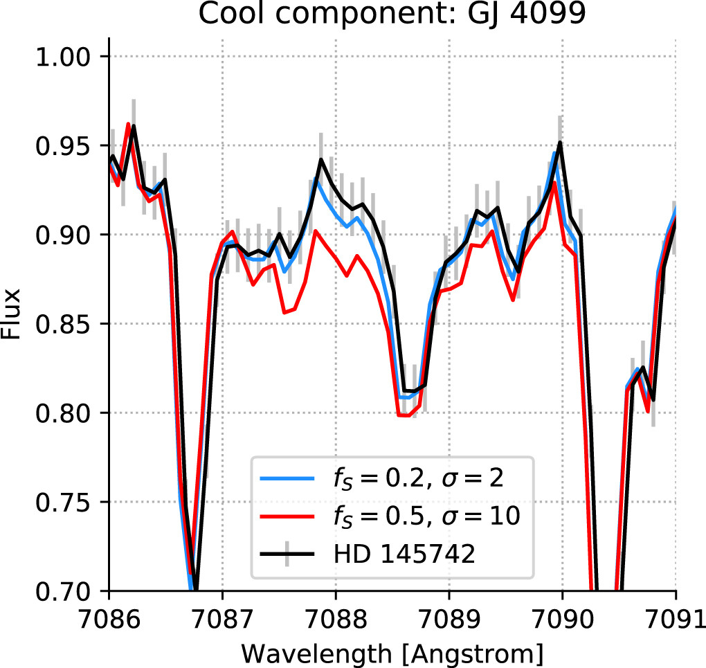 Synthetic two-component spectra created by combining HD 145742 with various spot coverages represented by the spectrum of GJ 4099. The flux-weighting of the spots conspires to make it extremely difficult to measure small spot coverage, though larger spot coverages can be measured robustly.