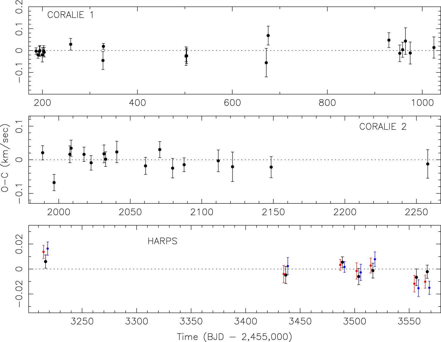 The residuals for the radial velocities measured by CORALIE (top and middle panels, black points) and HARPS (bottom panel, black points) for the best-fitting photodynamical model. The red and blue points show the residuals of the HARPS measurements for models with the planet mass fixed at 120 M⊕ and 150 M⊕, respectively.