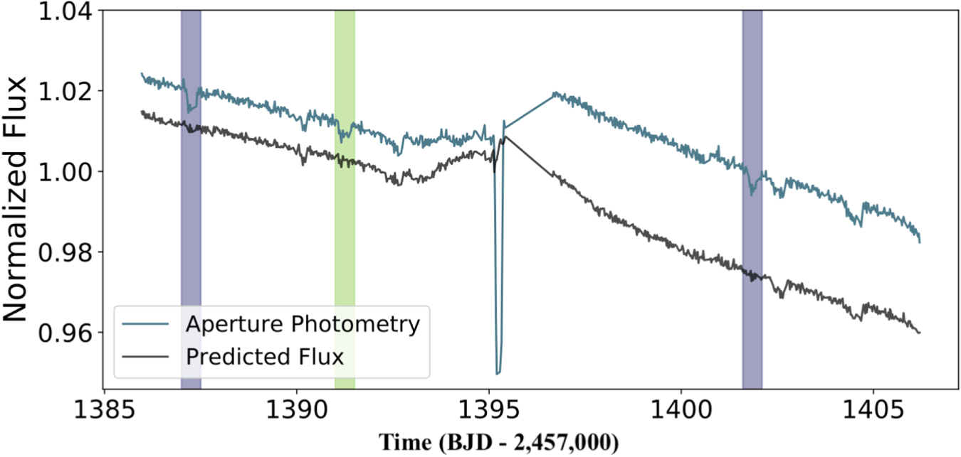 Aperture photometry for Sector 3 data (upper curve) with the flux model predicted from changes in the shape of the PSF at each cadence inferred by eleanor PSF modeling (lower curve). We expect that spurious events caused by changes in the PSF to appear in both curves, whereas astrophysical events, which occur independently of the instrumental PSF, will only appear in the upper curve. Thus, the apparent events near days 1390, 1403, and 1404 are caused by changes in the PSF shape that occur as parts of the star fall off and on the detector owing to pointing jitter. The purple- and green-shaded regions correspond to the locations of secondary eclipses and a transit of the planet, respectively. These events are apparent only in the upper curve, which is a strong indication of their validity. Finally, we note that the deep feature near day 1395 is a primary eclipse.