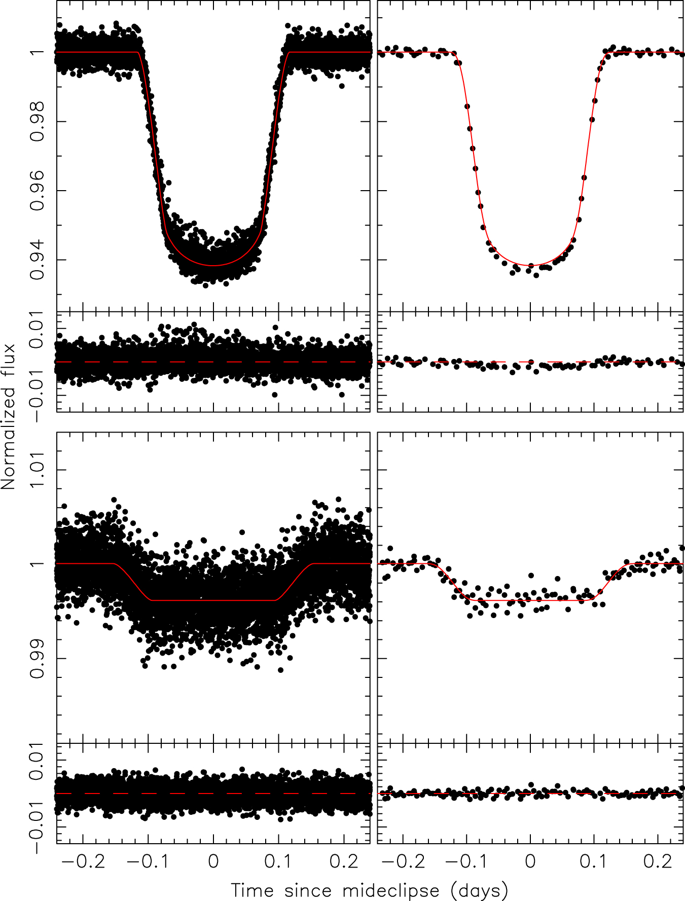 The folded primary and secondary eclipses are shown with the best-fitting model (solid red line). Upper left panel: primary eclipse in with residuals. Upper right panel: primary eclipse in and 30 minute cadence with residuals. Lower left panel: secondary eclipse in with residuals. Lower right panel: secondary eclipse in 30 minute cadence with residuals. There is a slight trend of the model being shallower than the long-cadence primary eclipses.