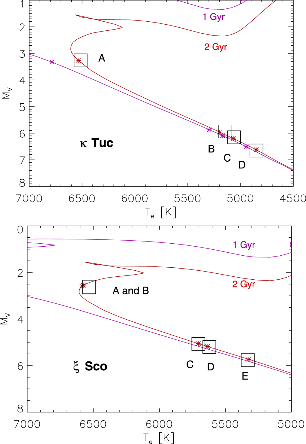 Hertzsprung–Russell diagram of κ Tuc (top) and ξ Sco (bottom) based on the data of Table 1. The magenta and red lines are PARSEC isochrones (Bressan et al. 2012) for solar metallicity and ages of 1 and 2 Gyr, respectively. Asterisks on the isochrones mark the adopted masses of the components.