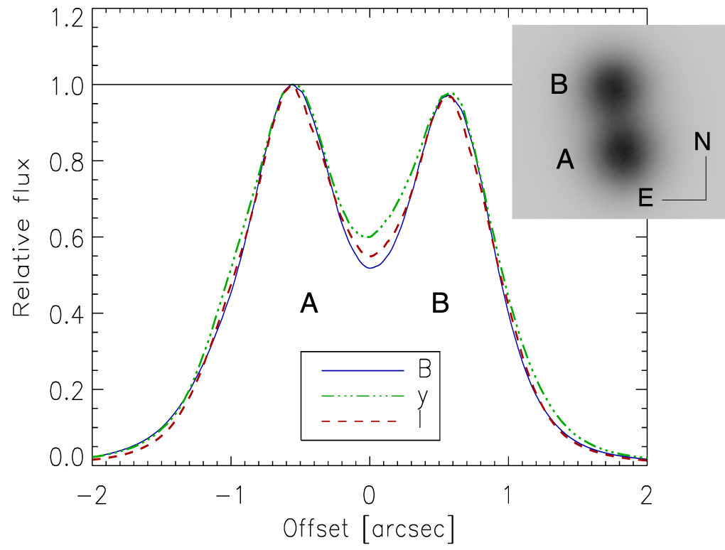 Scans of the recentered average images of ξ Sco AB taken on 2020 March 13 at SOAR in three filters. The flux is summed perpendicular to the binary, normalized by the maximum, and plotted along the separation direction. The northern component B is fainter than A by 3 ± 1% in all filters. The insert shows the average image of this pair taken on 2017 June 6 in the filter y (532 nm), with a separation of 1.″127 and a position angle of 7.°8.