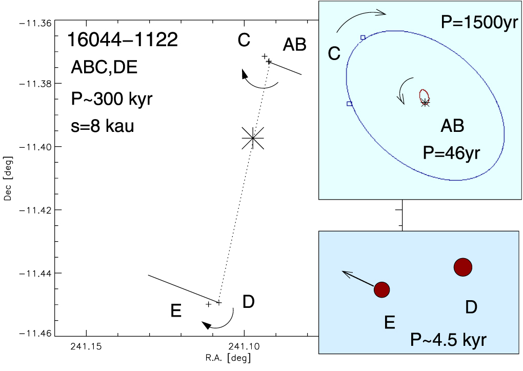Location of ξ Sco on the sky. The right-hand panels zoom in on the two groups. The asterisk marks the center of mass, the lines show motion of group centers relative to it.