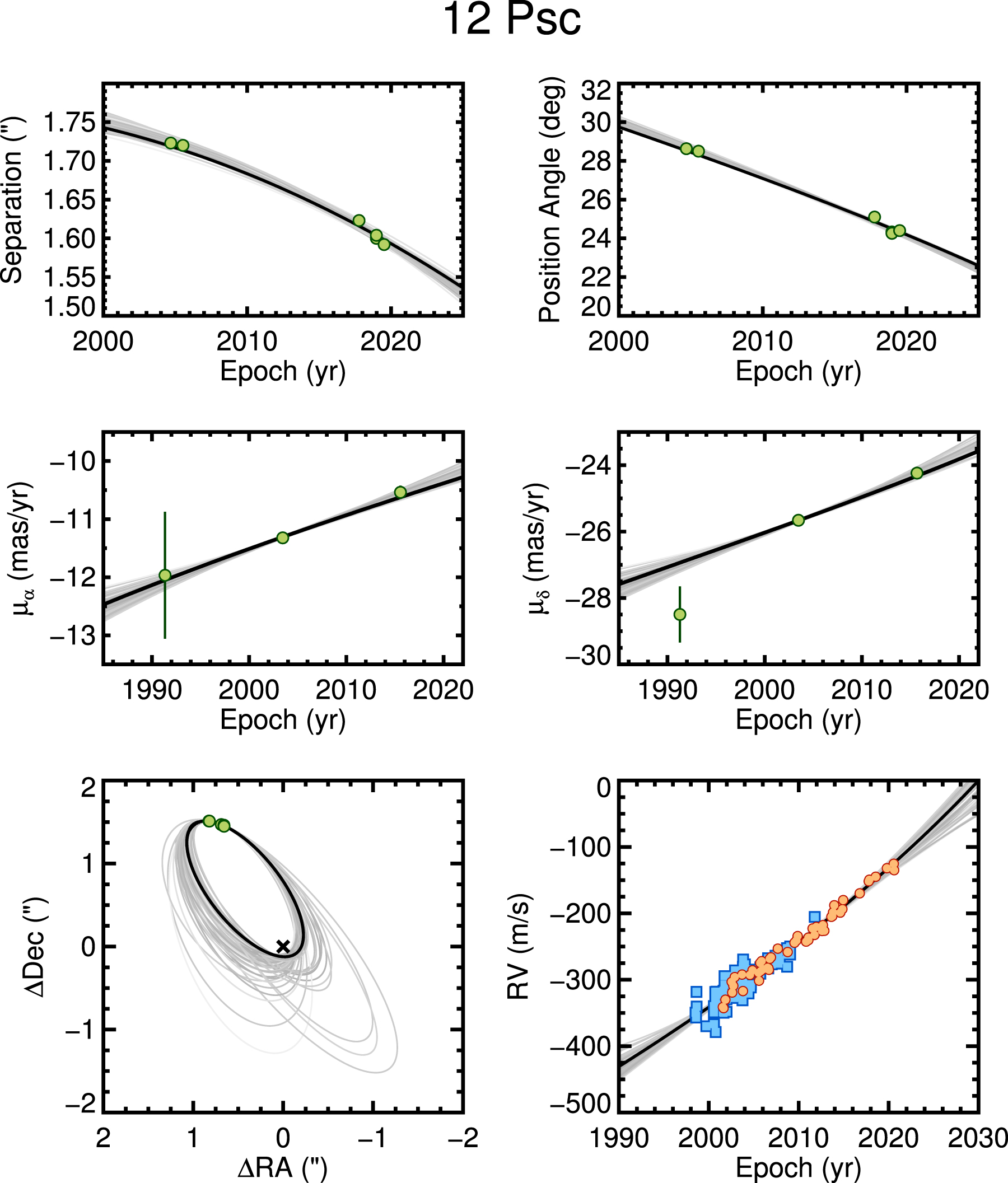 Keplerian orbit fit to the relative astrometry of 12 Psc B (top and lower left panels), the astrometric acceleration of the host star from the HGCA (middle panels), and RVs of 12 Psc (lower right panel). Fifty random orbits drawn from the MCMC chains are shown in gray and are color coded based on their χ2 values; darker gray indicates a lower χ2 value and a better fit. The best-fit orbit is shown in black. In the lower right panel, blue squares are Lick RVs and orange circles are from the Tull Spectrograph.