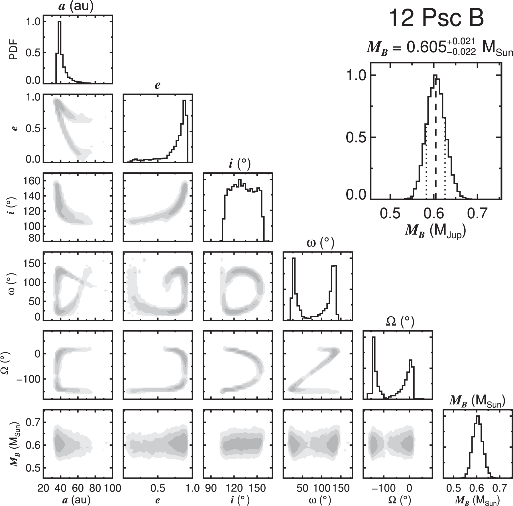 Corner plot showing joint posterior maps of various parameters and their marginalized probability density functions. The observations of 12 Psc B and its host star favor a high-eccentricity orbit and a semimajor axis of ≈40 au. The dynamical mass of the white dwarf companion 12 Psc B is ﹩{0.605}_{-0.022}^{+0.021}﹩ M⊙.