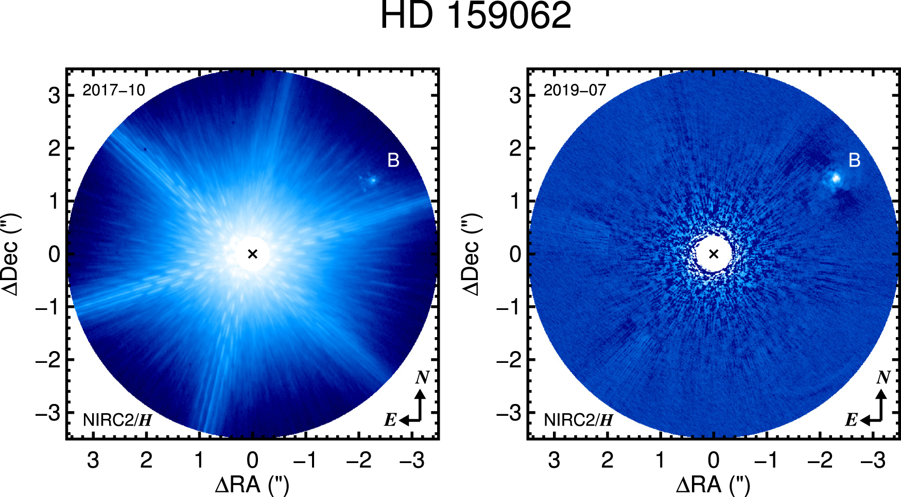 NIRC2 adaptive optics H-band observations of HD 159062 and its white dwarf companion. No additional point sources at smaller separations are evident in the post-processed 2019 July angular differential imaging sequence.