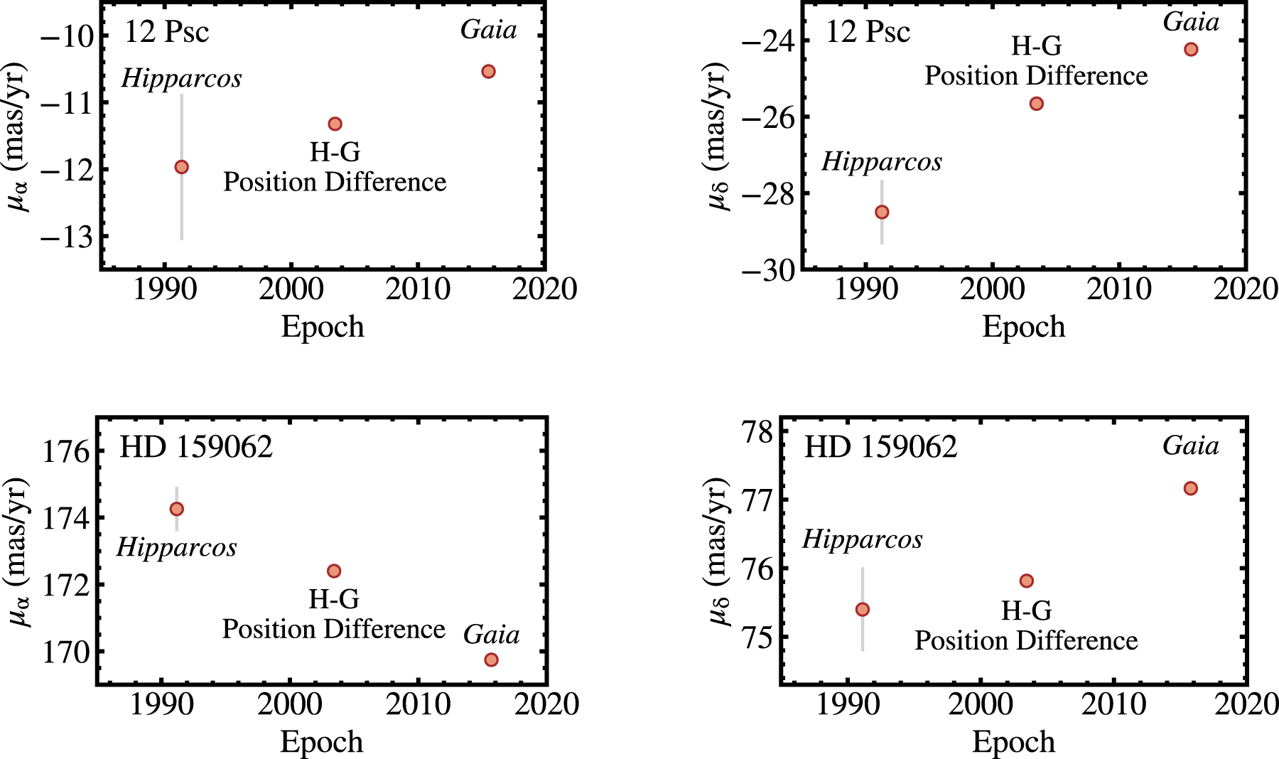 Proper-motion measurements from HGCA in R.A. and decl. for 12 Psc (top) and HD 159062 (bottom). Three measurements are available: the instantaneous proper motion from Hipparcos, a similar measurement from Gaia DR2, and the scaled positional difference between the two missions (see Brandt 2018 for details). Both 12 Psc and HD 159062 show clear changes in acceleration from 1991 to 2015; the slope of these proper-motion measurements represents the astrometric acceleration.