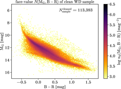 Face-value distribution of the WD sample members in the ﹩{N}_{{ \mathcal C }}({M}_{G},(B-R))﹩ plane, after all the selection function cuts summarized in Equation (8) have been applied. The units of this distribution are the number of objects/mag2.