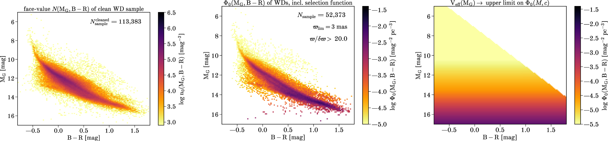 Comparison of the cleaned sample of likely WDs, ﹩{N}_{{ \mathcal C }}({M}_{G},(B-R))﹩ (left, with units [mag−2 ]) with the modeled white dwarf LCF, Φ0(MG, (B − R)) (center, with units [mag−2 pc−3]). The (MG, (B − R)) domain covered by both distributions is of course the same. Yet, the density peaks of ﹩{N}_{{ \mathcal C }}({M}_{G},(B-R))﹩ and of Φ0(MG, (B − R)) are in dramatically different places in the (MG, (B − R)) plane. The reason is that the two distributions differ by the selection function integral (expressed here via Veff), which is shown in the right panel; in the case at hand the selection function ends up being only a function of MG, not (MG, (B − R)); the survey volume in the top-right corner of the (MG, (B − R)) plane is zero, as such objects were excluded by the initial Gaia parent catalog query.