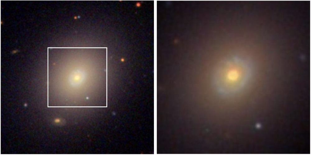 In the left, the SDSS g, r, and ibands composite image (130″ × 130″) of NGC 3182 galaxy. In the right, the zoom-in image of the central 50″ × 50″ (white box in the left column). North is to the top and east is to the left.