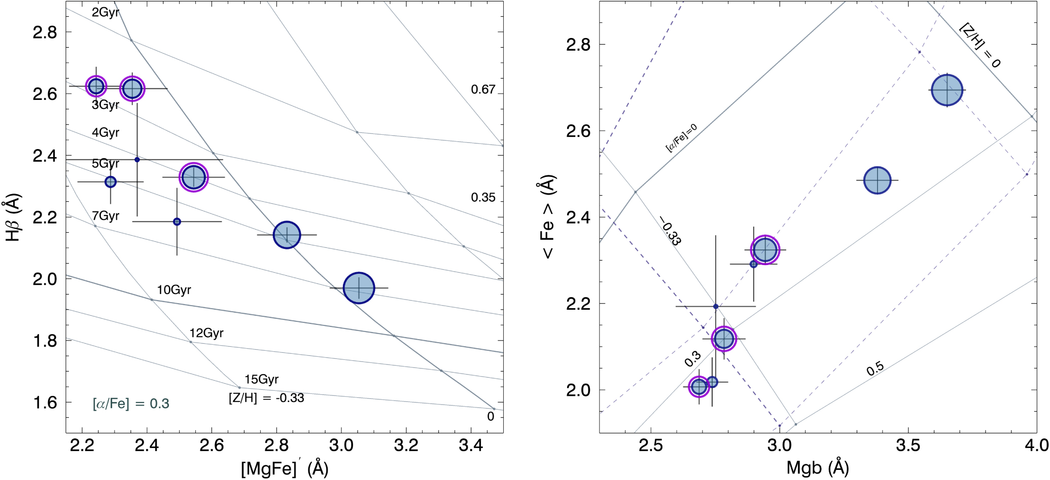 Hβ vs. [MgFe]﹩{}^{{\prime} }﹩ (left) Mgb vs. 〈Fe〉 (right) diagrams for NGC 3182 from center to outskirt with TMB model grids for ages, metallicities, and abundance ratios. The line strengths are measured along annuli. Symbol sizes are proportional to the radius. The regions of the star-forming ring (3″–8″) are enclosed with violet circles. In the Mgb vs. 〈Fe〉 diagram, solid and dashed lines are the 10 Gyr and 2 Gyr models, respectively. The model lines of [Z/H] = 0 in the right panel are emphasized as thick lines for each age. Each error bar indicates the measurement uncertainties in each annulus.