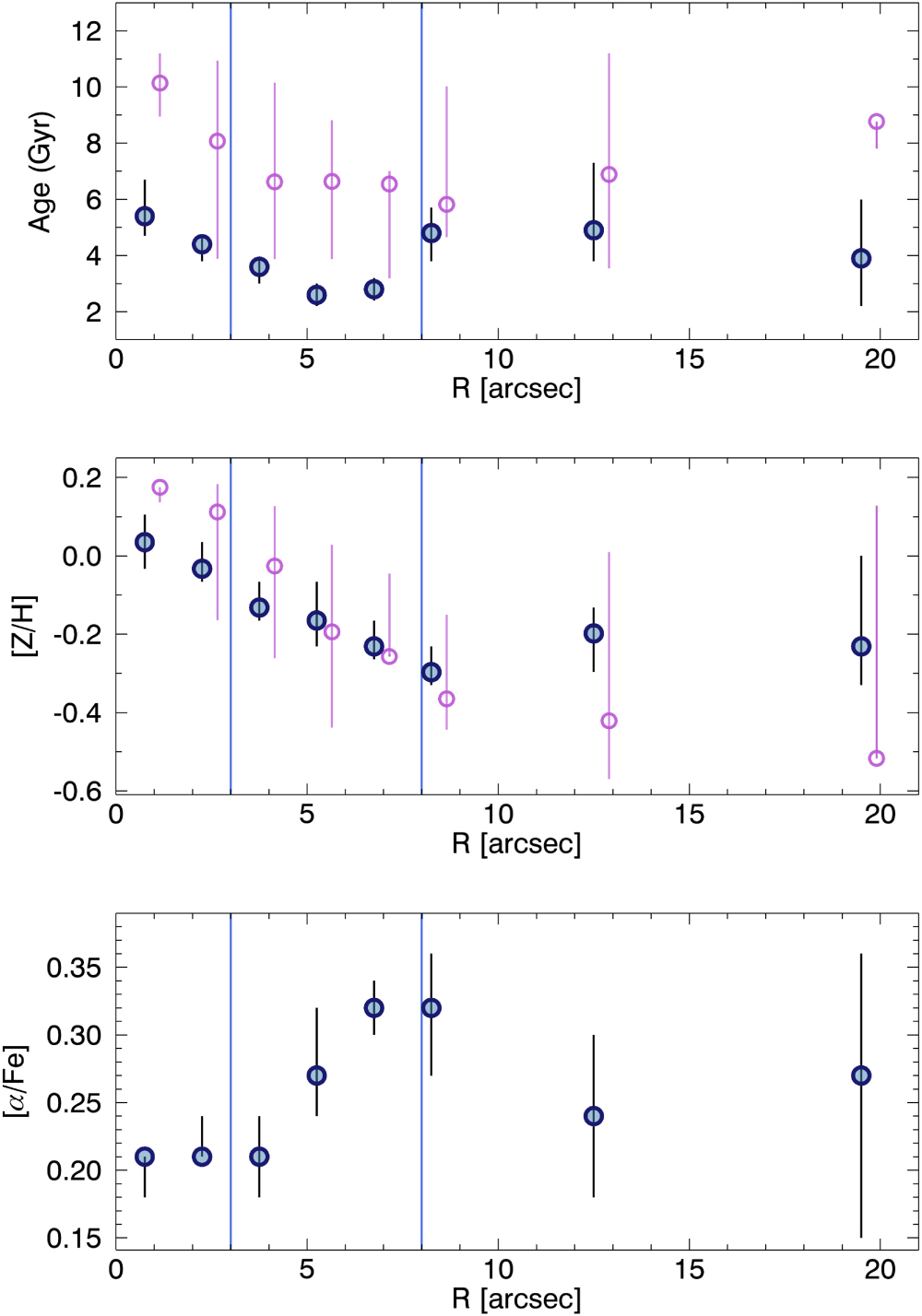 Age, metallicity, and α-abundance profiles. Filled symbols are from the measurement of lick indices absorption line strengths with the measurement uncertainties on each point are shown. Open symbols are from the measurement of mass-weighted age and metallicity by full spectral fitting using pPXF, the error bars of which connect the maximum and minimum values measured from individual spaxels within each annulus. The vertical lines indicate the inner and outer boundaries of the star-forming ring.