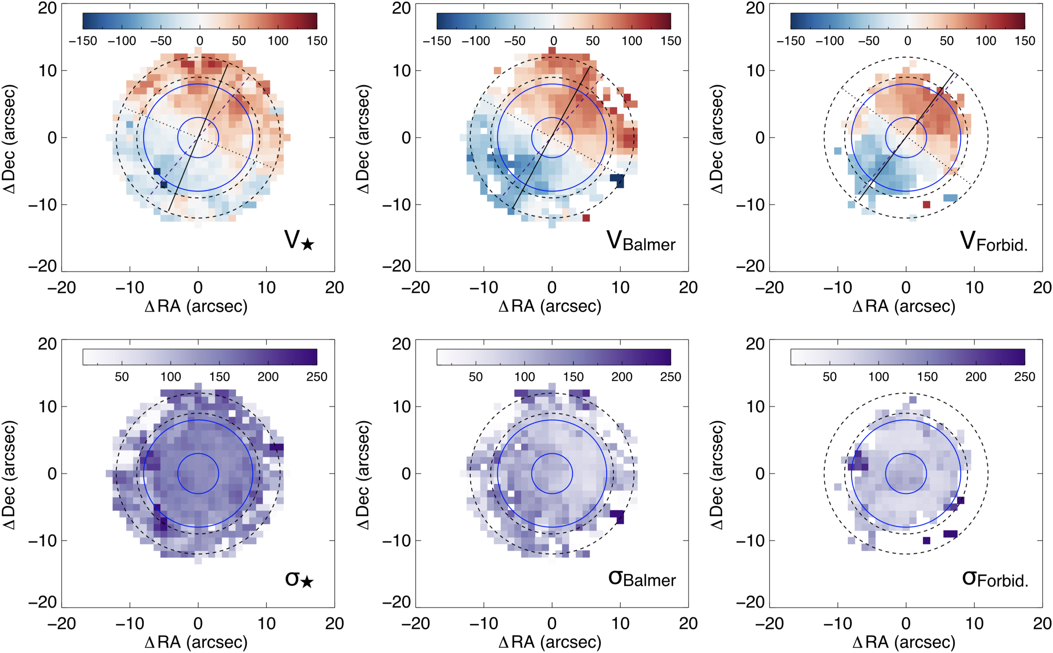 The velocity (v) and the velocity dispersion (σ) maps of stellar, balmer, and forbidden lines for the NGC 3182. The solid circles indicate the inner and outer boundaries of the star-forming ring. The inner and outer dashed circles imply the S/Ncontinuum of ∼30 and 20, respectively. Hα> 1.5 Å. [N II] or [O III] > 1.5 Å.