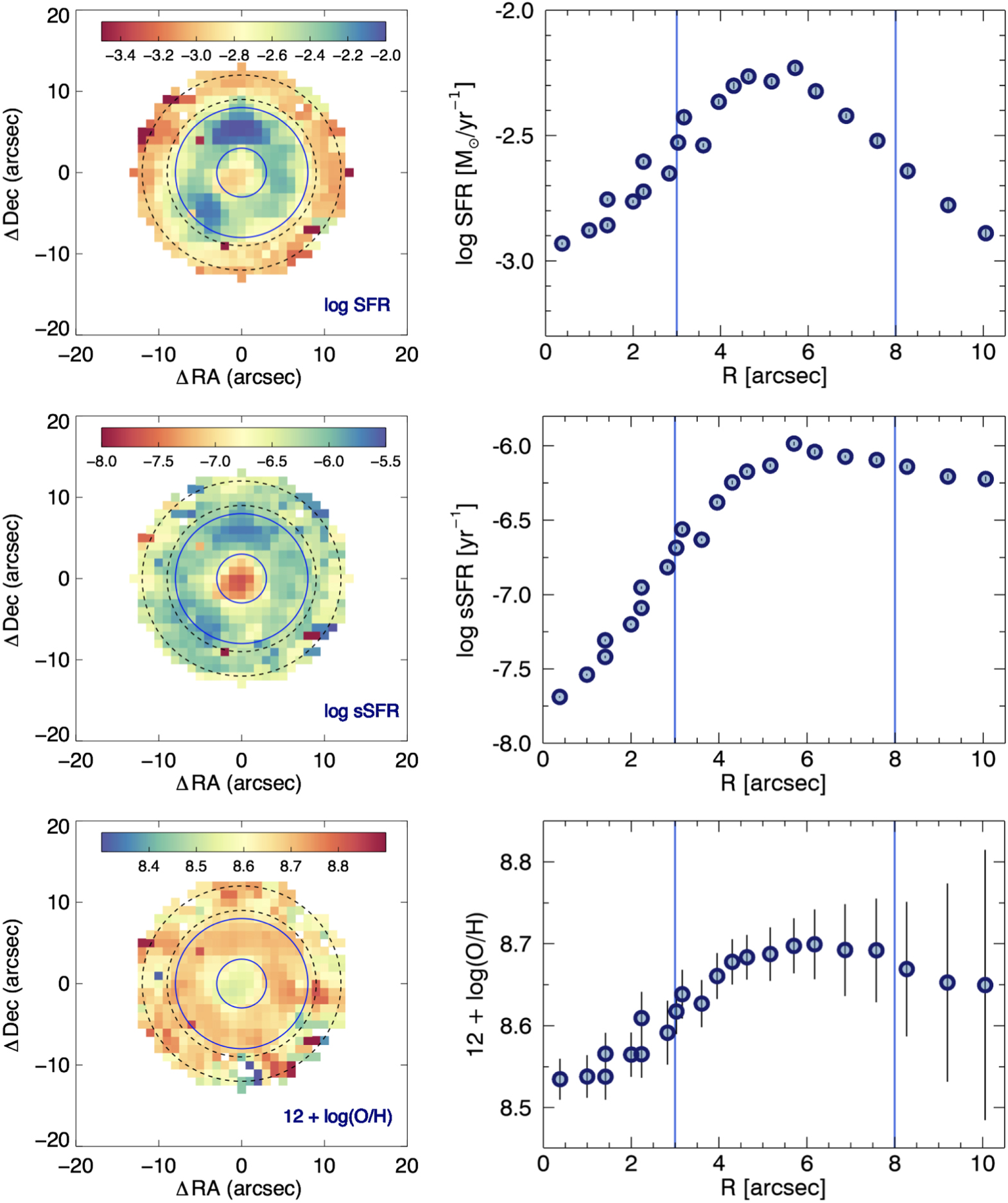 The maps (left) and profiles (right) of the specific star formation rate (top) and gas metallicity (bottom) with corresponding uncertainties. The radial profiles are obtained from the isophotal ellipses using the IRAF/ELLIPSE task (Jedrzejewski 1987). The vertical lines distinguish the region of the star-forming ring. The error bars for log SFR and log SFR are shown but their sizes are smaller than the symbol size.