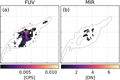The GALEX FUV (a) and WISE-W4 band (b) images of NGC 6822 degraded to 48.0″ × 48.0″. The contour presents H I gas distribution where its column density is higher than 3.6 × 1019 cm−2.