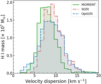 The mass distribution for the velocity dispersions. The bin width of the histogram is 0.8 km s−1. Green, red, and blue bars indicate the H I mass distribution derived from MOMENT0, SGfit, and OptGfit (BAYGAUD) integrated flux density maps, respectively.