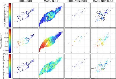 Atlas of kinematic classification of H I gas. The figure shows the maps of flux density, centroid velocity, and velocity dispersion of cool-bulk (V disp ≤ 4.0 km s−1 with bulk motion), warm-bulk (V disp > 4.0 km s−1 with bulk motion), cool-non-bulk (V disp ≤ 4.0 km s−1 with non-bulk motion), and warm-non-bulk (V disp > 4.0 km s−1 with non-bulk motion) gas components. The dashed circle and solid square on the map of warm-bulk flux density represent the NW cloud and the H I shell, respectively. The solid rectangle on the map of warm-non-bulk flux density shows possible candidate HVCs. The points with gray empty boxes on each velocity map present the pixels that have more than one component in the same classification. The black dashed rectangle in the bottom right panel shows the region we disregard in the subsequent analysis.