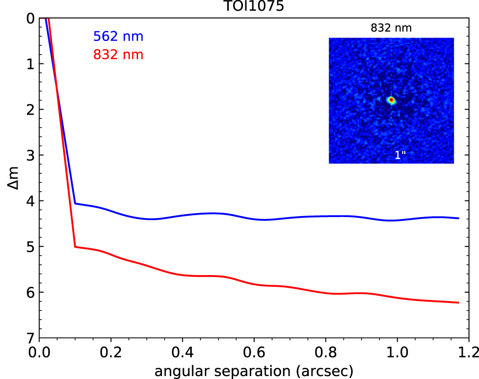 Gemini-South Zorro contrast curves for 562 (blue line) and 832 (red line) nm speckle observations and 832 nm image (inset) of TOI-1075. No visual companions are detected anywhere in Zorro’s field of view.