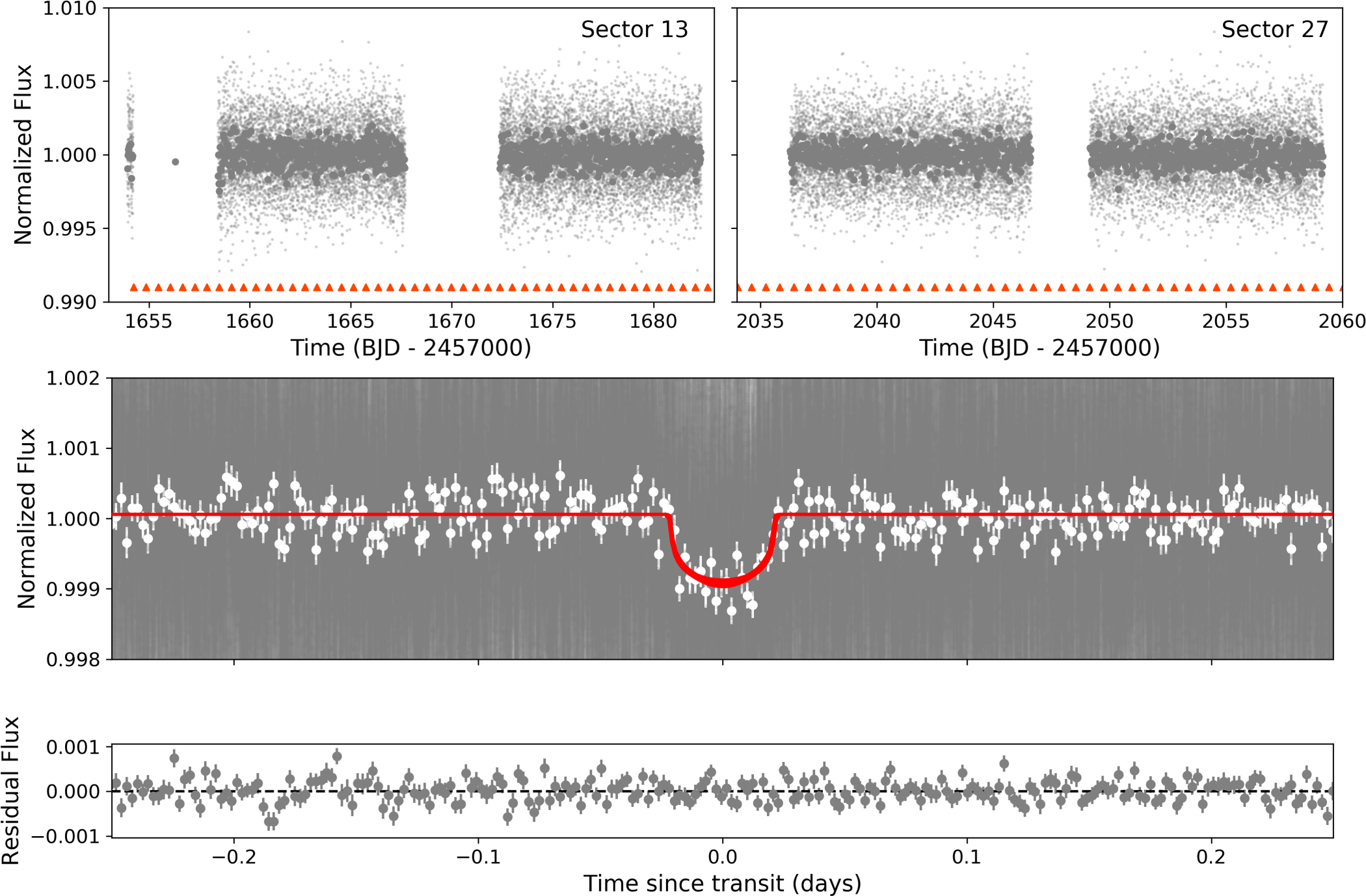 TESS light curves of TOI-1075. Top: detrended, normalized, and flattened PDCSAP flux measurements for Sector 13 (left) and Sector 27 (right). Lighter gray points are the TESS 2 minute cadence flux measurements; darker points are the same data binned into 30 minute intervals. The transits of TOI-1075 b are marked by orange triangles. Middle: phase-folded light curve on the planet’s orbital period (0.605 day), along with the best-fit transit model (red). Gray points are 2 minute cadence measurements; white points are the same data binned into 5 minute intervals. Bottom: residuals after the data have been subtracted from the best-fit model.