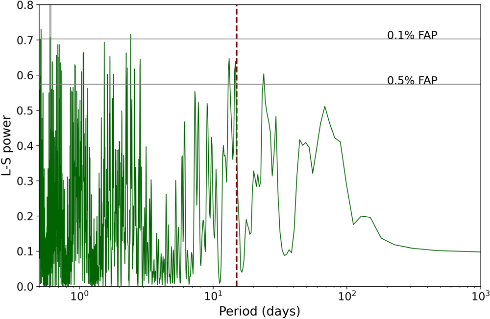 The GLS periodogram of the RV measurements from PFS. There is a clear peak at the period of TOI-1075 b (gray bar). We identify a stellar activity signal at ∼15 days (red dashed line) that is well separated from TOI-1075 b’s orbital period.