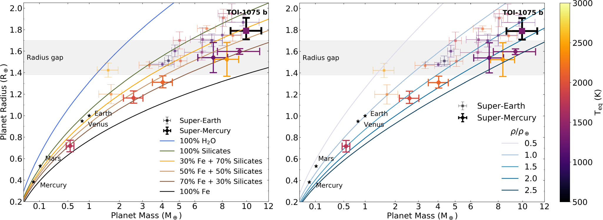 Mass–radius diagram for small planets (R p < 2 R ⊕ and M p < 10 M ⊕) with measured mass and radius uncertainties below 30%, as listed in the NASA Exoplanet Archive (only planet masses measured by the RV method are considered). Planets are colored according to their calculated equilibrium temperature (assuming zero albedo and efficient heat redistribution). Super-Earth planets are shown with squares, and super-Mercury planets are shown with diamonds. The gray shaded region denotes the radius gap for low-mass stars centered at 1.54 ± 0.16 R ⊕ (Cloutier & Menou 2020). The terrestrial solar system planets are plotted for reference. Left: mass–radius diagram with curves of constant composition. The solid lines are theoretical internal composition curves (Zeng et al. 2021; Lin et al. 2022, in preparation). From top to bottom: 100% H2O (blue), 100% silicates (green), a mixture of 30% Fe and 70% silicates by mass (orange), a mixture of 50% Fe and 50% silicates by mass (light brown), a mixture of 70% Fe and 30% silicates by mass (dark brown), and 100% Fe (black). The bulk density of TOI-1075 b is consistent with a 35% Fe + 65% silicates by mass composition. Right: mass–radius diagram with curves of constant density relative to Earth. The density of TOI-1075 b is ∼1.75 times greater than the Earth.
