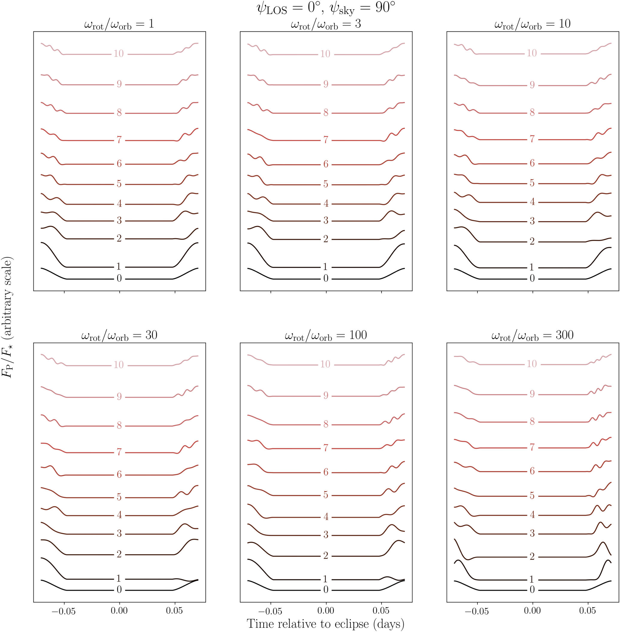 The uniform brightness curve and the first 10 eigencurves with uniform components added for our Warm Jupiter model, at a range of rotation rates with ψ sky = 90°. Rotation rates span the scale from “slow” where the planet rotates a small fraction of a full rotation across eclipse (N tot < 1), to “fast” where the planet rotates through a considerable fraction of a full rotation. At the fastest rate the planet’s rotation period approaches the duration of ingress or egress (N i,e → 1). For reference, with our prototypical 10 day Warm Jupiter, N tot = 1 corresponds to ω rot/ω orb ≈ 71, and N i,e = 1 corresponds to ω rot/ω orb ≈ 432. One might notice that some eigencurves dip below the baseline where the planet is completely behind the star and contributes nothing to the observed flux. The eigencurves are initially generated from spherical harmonics, which each have zero net global brightness. Therefore, the eigencurves themselves start out as combinations of maps which each have zero net brightness. To “reconstitute” the eigencurves, we plot them here as additions on top of the uniform brightness curve. This allows for an eclipse curve composed of a single eigenmode to be unphysical, i.e., have net negative flux at some points.