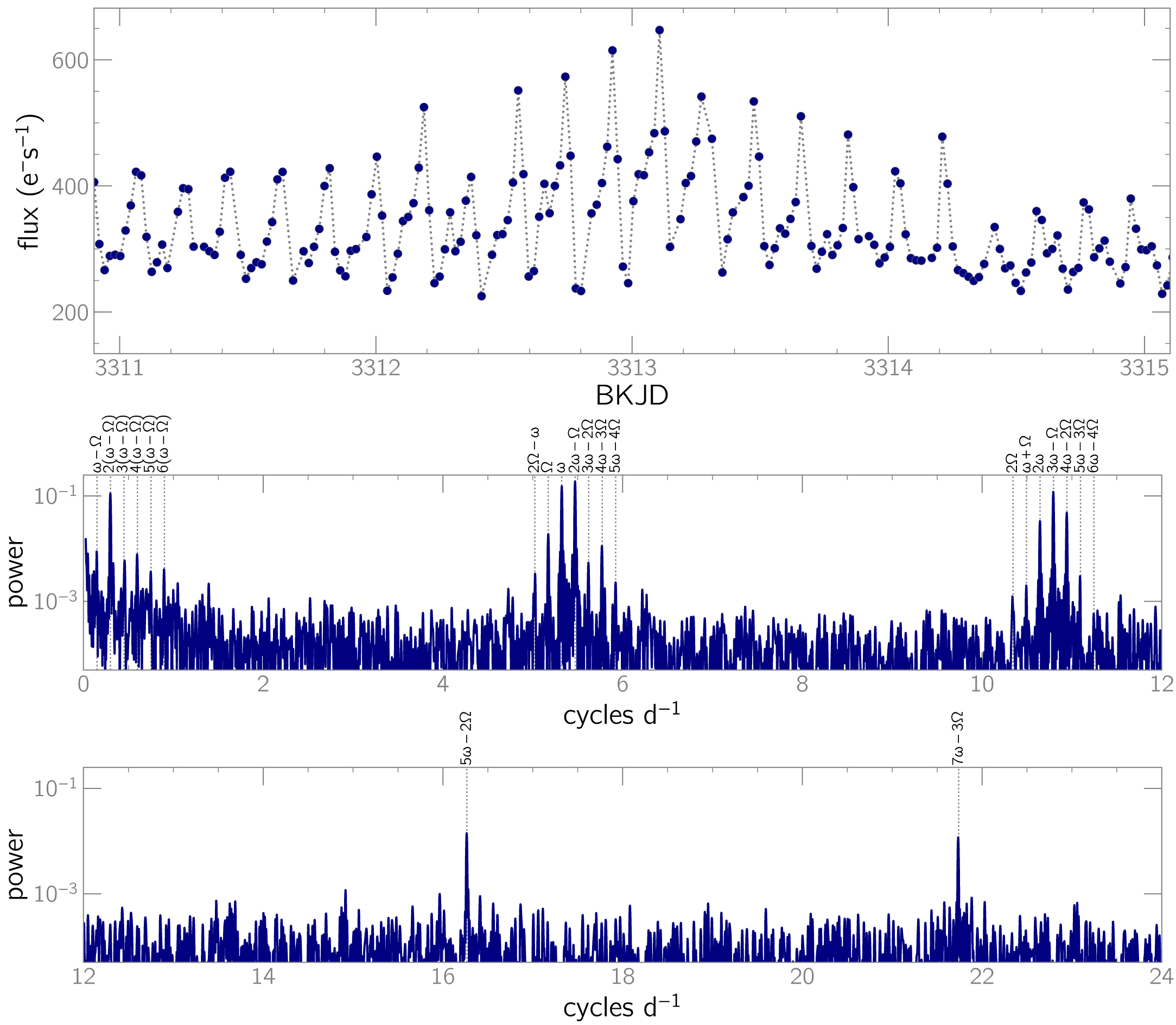Top panel: representative ∼4-day segment of the K2 light curve of J0846. Each datum is a 30-minute integration, and consecutive measurements have been joined with dotted line segments to guide the eye. Flux uncertainties are negligibly small at this scale. BKJD is defined as JD −2,454,833. Middle and bottom panels: Lomb–Scargle power spectrum of the K2 light curve of J0846, split into two panels to improve the visibility of major frequencies. ω is the WD’s spin frequency and Ω is the binary orbital frequency.