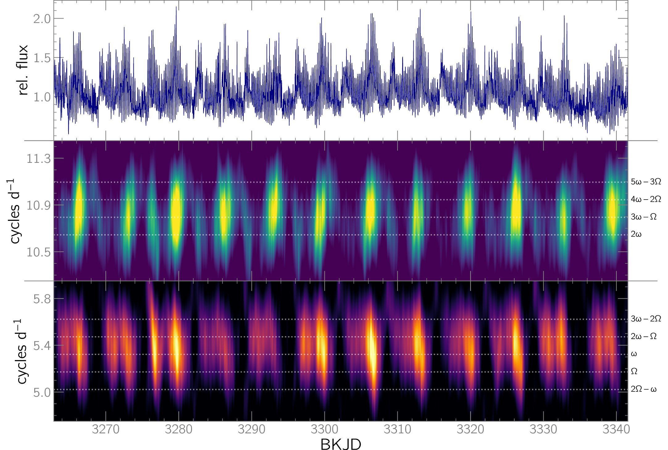 Light curve and 2D power spectra for J0846. BKJD is defined as BJD –2,454,833. The middle and bottom panels use different color maps to reflect that they have different intensity cuts. The size of the sliding window is 0.5 days.