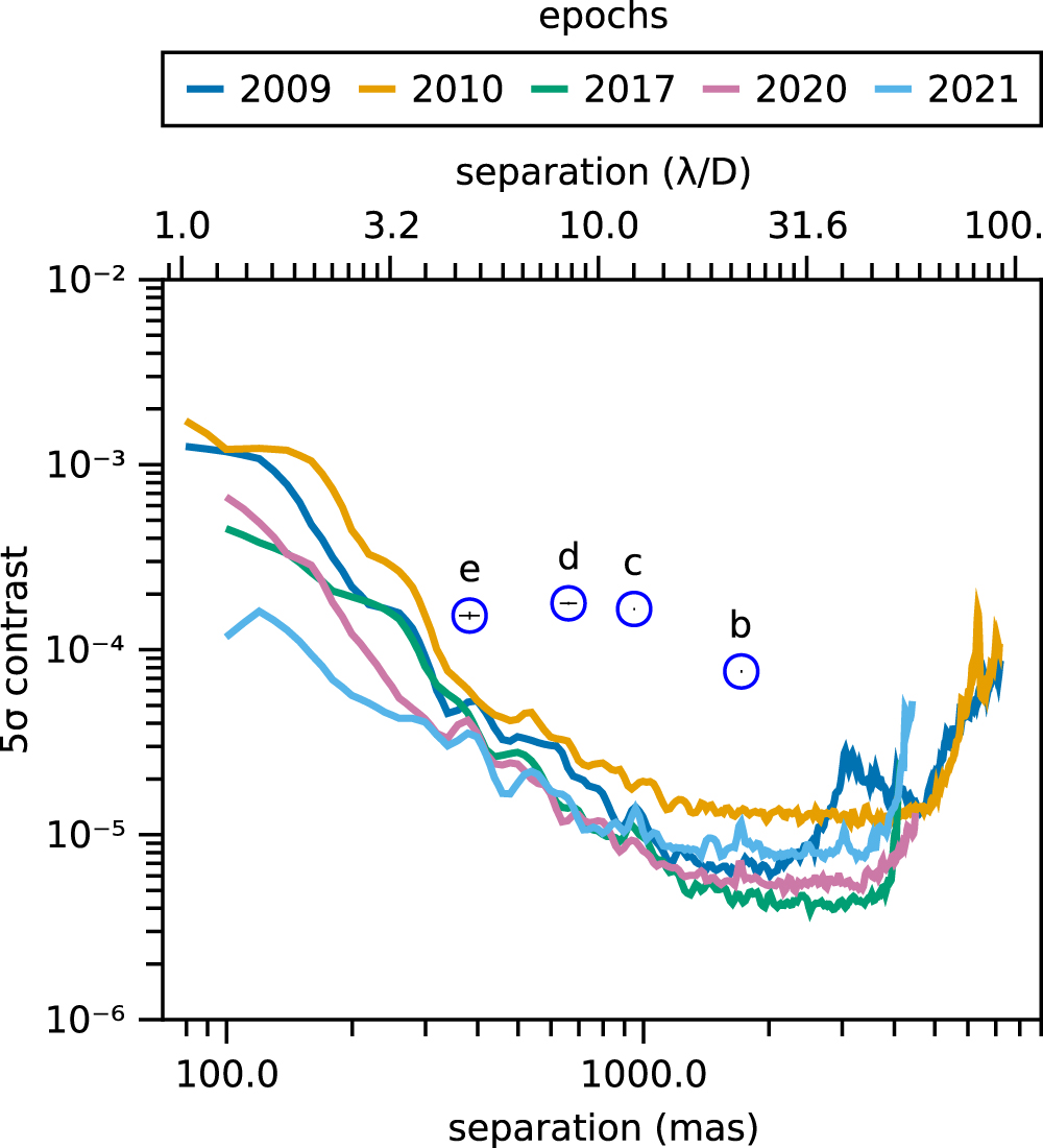 5σ contrast limits at each of the five L′ epochs on a log-log scale. Blue circles mark the average separations and photometry from our results. The contrast achieved close to the star has improved over time, so later epochs have more weight in our modeling.