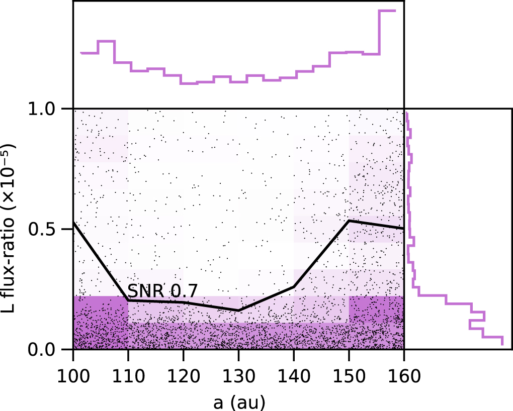 Flux-ratio and semimajor axis marginal posteriors for an additional outer planet between planet b and the start of the outer debris disk. The black line gives the 84th percentile flux as a function of semimajor axis. No planet is detected, and our sensitivity is not strongly dependent on any of the orbital parameters within this range of semimajor axis.
