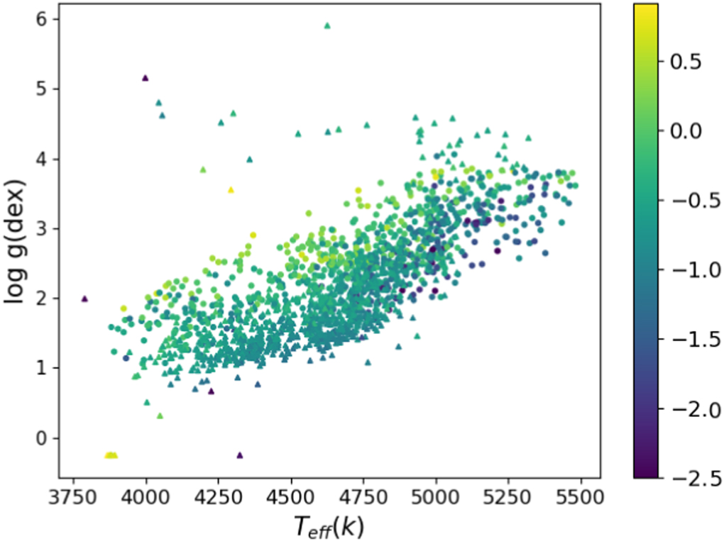 Distribution of barium stars adopted as positive samples in the plane of T eff–﹩\mathrm{log}g﹩, the colors indicate the [Fe/H] of stars. The triangle symbols indicate the barium star sample provided by L18, and the dot symbols indicate samples provided by N19.